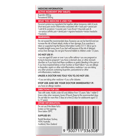 Do not give Nuromol tablets to children under 12 years. Do not take with other products containing paracetamol or ibuprofen or other anti-inflammatory medicines. If an overdose is taken or suspected ring the Poisons Information Centre (13 11 26) or go to hospital straight away even if you feel well because of the risk of delayed, serious liver damage.
