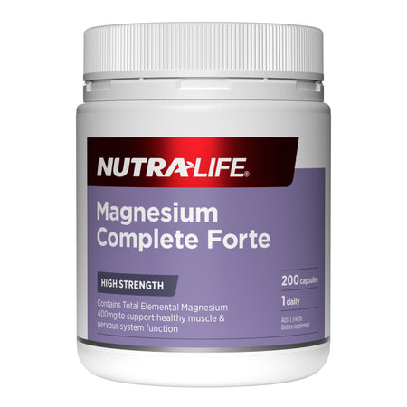 Nutra-Life Magnesium Complete Forte provides magnesium in various forms to support increased magnesium intake and absorption. It contains 200 capsules with magnesium oxide, citrate, hydroxycitrate, glycinate, and taurinate to assist with muscle relaxation, cardiovascular health, and energy production.