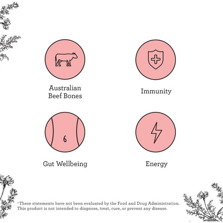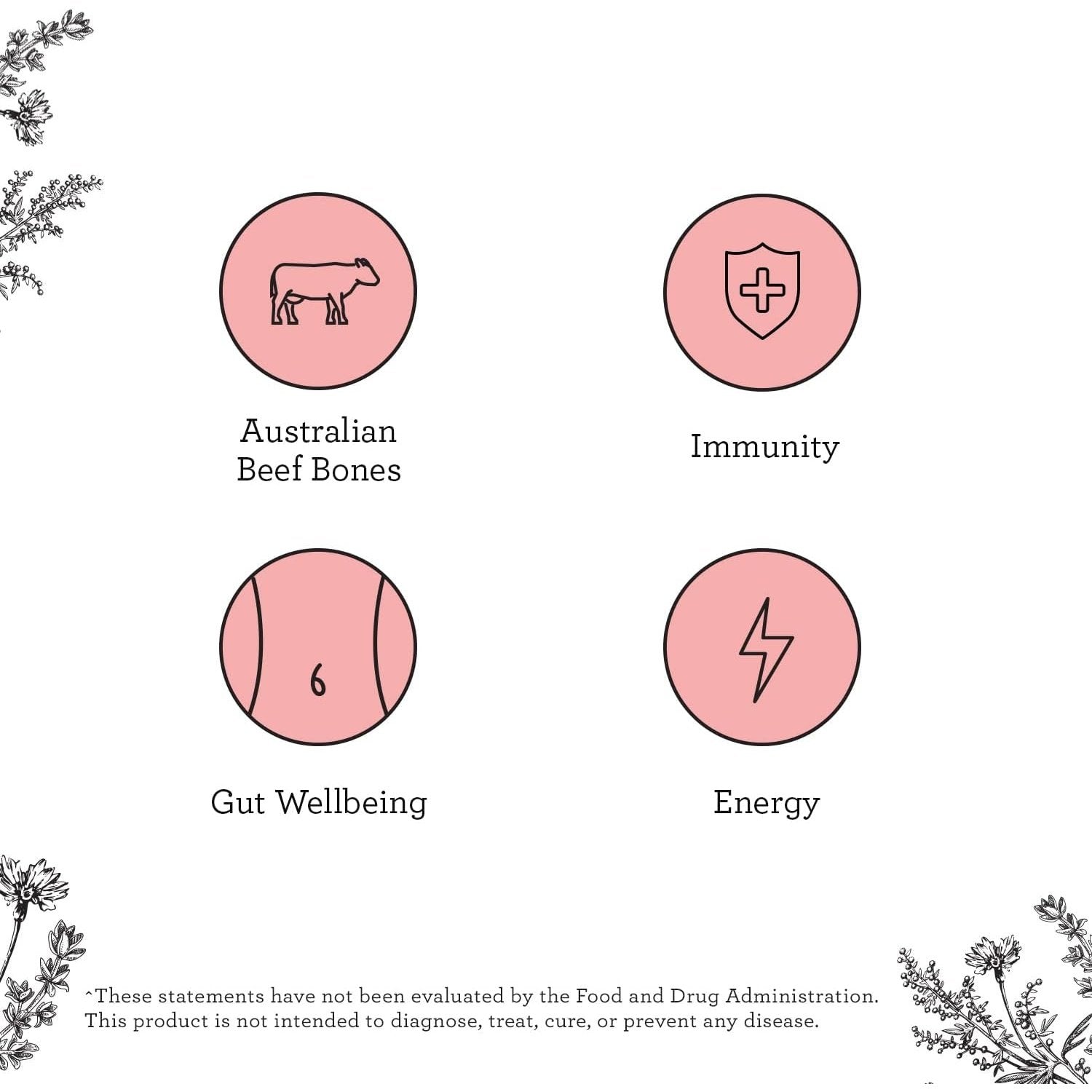 Beef bones are added to filtered water and apple cider vinegar (to maximise nutrient extraction) then slow cooked for over 18 hours. The broth is then strained for impurities and the fat is skimmed off the top. It is gently refractance dried into a powder, taking care to preserve the nutritional profile.