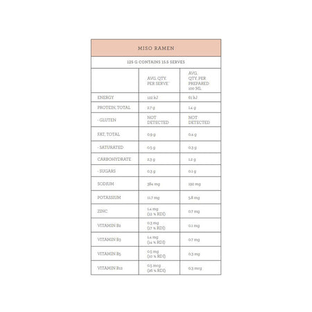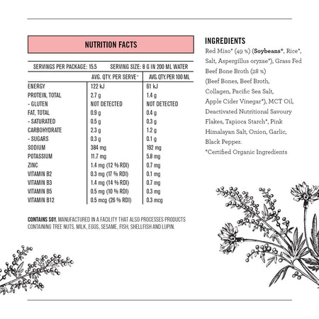 Red Miso* (49%) (Soybeans*, Rice*, Salt, Aspergillus oryzae*), Grass Fed Beef Bone Broth (28%) (Beef Bones, Beef Broth, Collagen, Pacific Sea Salt, Apple Cider Vinegar*), MCT Oil*, Deactivated Nutritional Savoury Flakes, Tapioca Starch*, Pink Himalayan Salt, Onion, Garlic, Black Pepper. *Certified Organic Ingredients