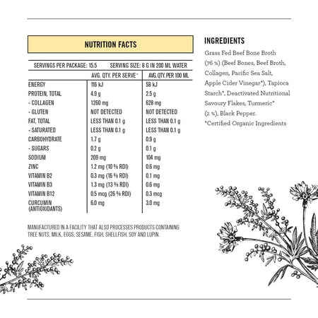 Grass Fed Beef Bone Broth (76%) (Beef Bones, Beef Broth, Collagen, Pacific Sea Salt, Apple Cider Vinegar*), Tapioca Starch*, Deactivated Nutritional Savoury Flakes, Turmeric* (2%), Black Pepper. *Certified Organic Ingredients