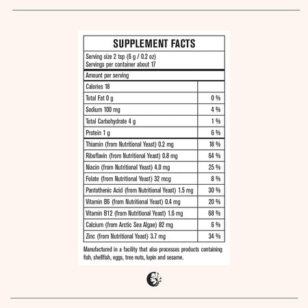 Deactivated Nutritional Savoury Flakes, Vegetables (14%) (Garlic, Pumpkin*, Kale*, Spinach*, Sweet Potato, Carrot*, Broccoli, Onion), Red Miso* (13%) (Soybeans*, Rice*, Salt, Aspergillus oryzae*), Mirepoix (Onion, Carrot, Celery, Salt, Garlic, Pepper), Tapioca Starch*, Pink Himalayan Salt, Turmeric*, Aquamin Marine Minerals* (Arctic Sea Algae*), Brown Rice Protein*, Tasmanian Kelp, Parsley, Chives, Black Pepper. *Certified Organic Ingredients