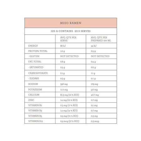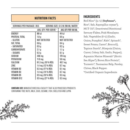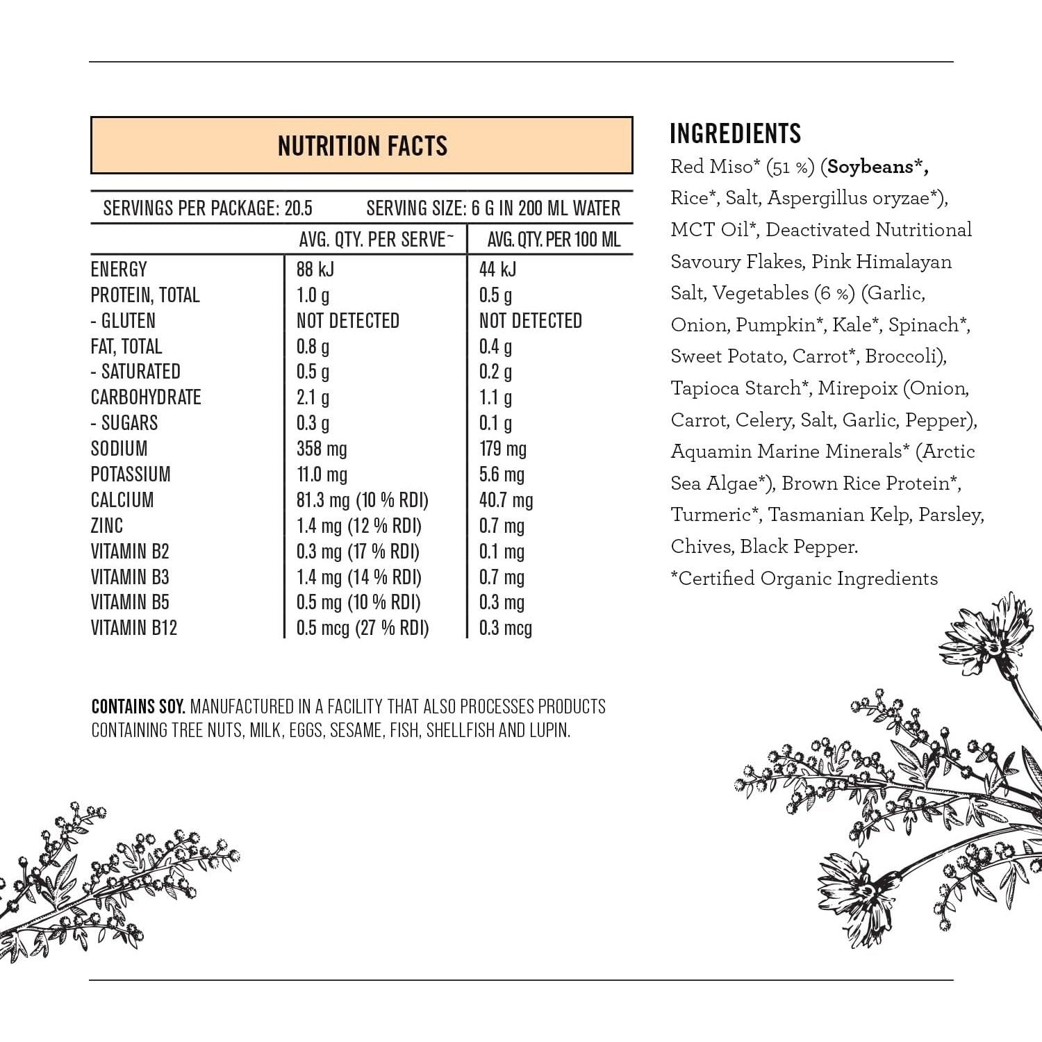Red Miso* (51%) (Soybeans*, Rice*, Salt, Aspergillus oryzae*), MCT Oil*, Deactivated Nutritional Savoury Flakes, Pink Himalayan Salt, Vegetables (6%) (Garlic, Onion, Pumpkin*, Kale*, Spinach*, Sweet Potato, Carrot*, Broccoli), Tapioca Starch*, Mirepoix (Onion, Carrot, Celery, Salt, Garlic, Pepper), Aquamin Marine Minerals* (Arctic Sea Algae*), Brown Rice Protein*, Turmeric*, Tasmanian Kelp, Parsley, Chives, Black Pepper. *Certified Organic Ingredients