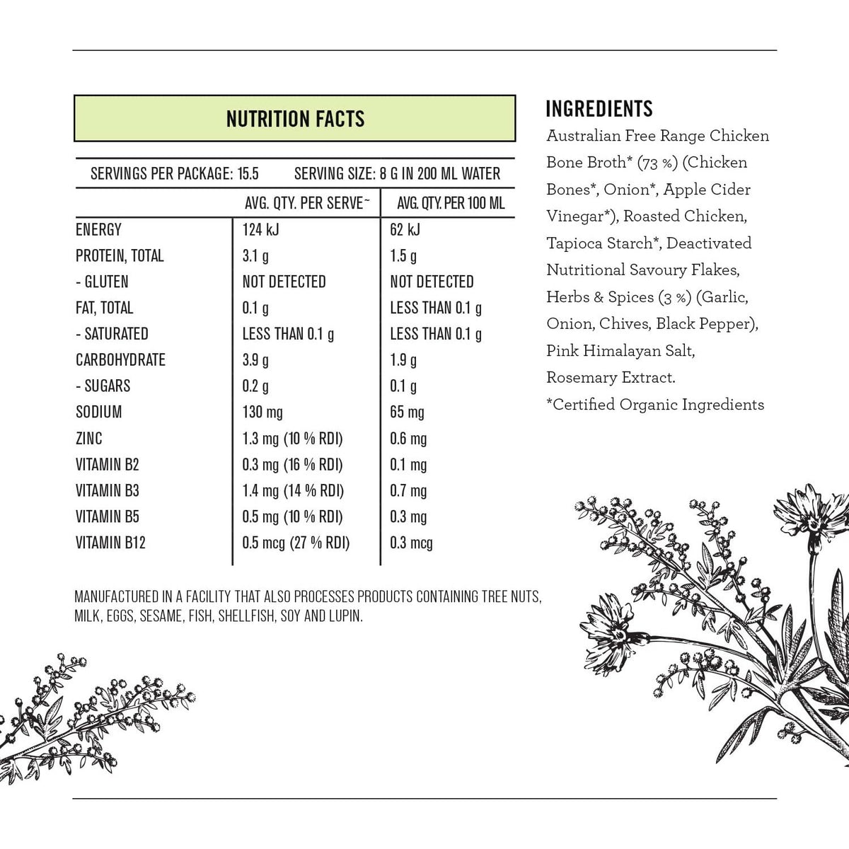 Australian Free Range Chicken Bone Broth* (73%) (Chicken Bones*, Onion*, Apple Cider Vinegar*), Roasted Chicken, Tapioca Starch*, Deactivated Nutritional Savoury Flakes, Herbs & Spices (3%) (Garlic, Onion, Chives, Black Pepper), Pink Himalayan Salt, Rosemary Extract. *Certified Organic Ingredients