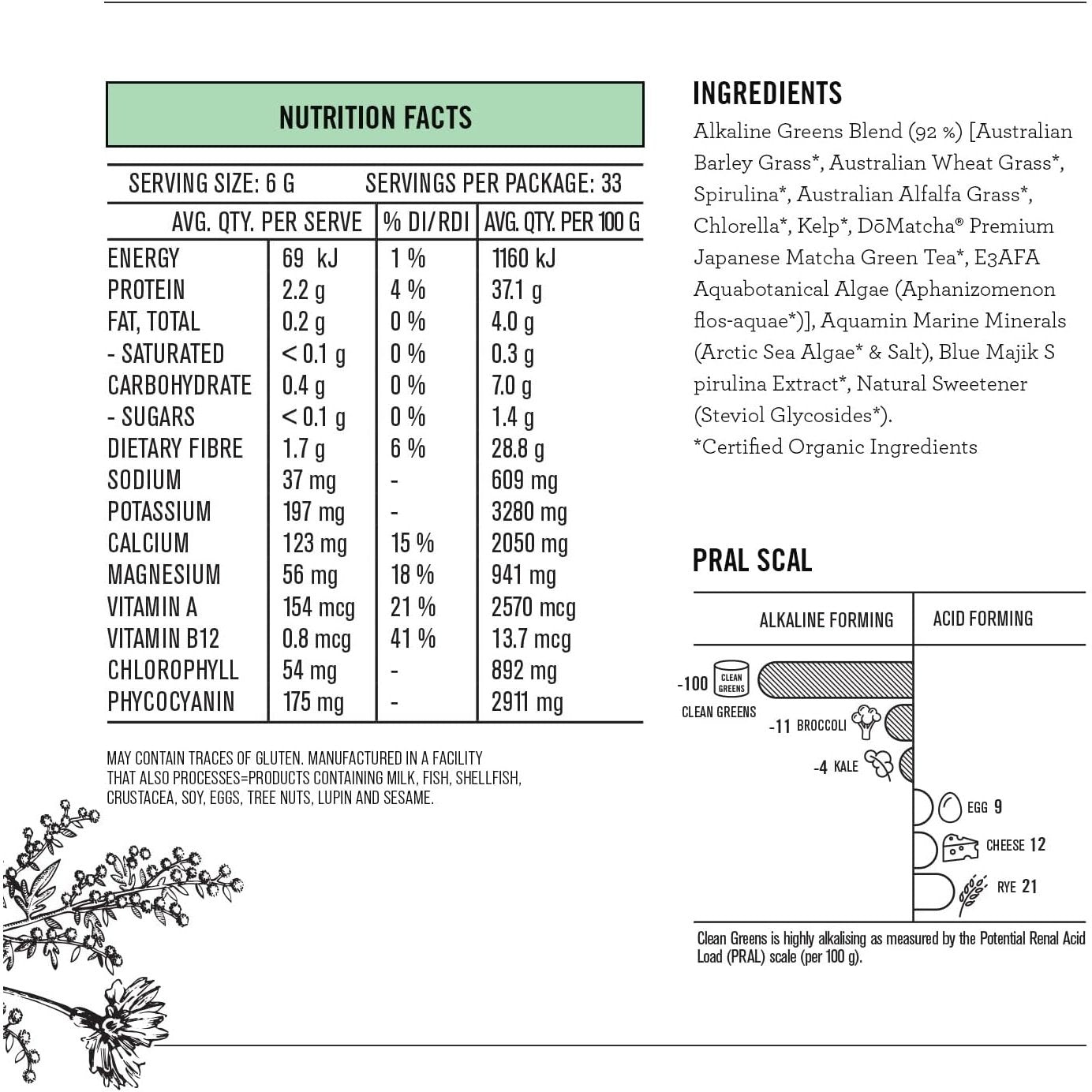 Organic pH 7.3 Clean Greens Blend 9289 mg: Barley Grass Juice Powder*, Wheat Grass Juice Powder, Spirulina*, Alfalfa*, Chlorella*, Kelp*, Do-Matcha Green Tea Powder