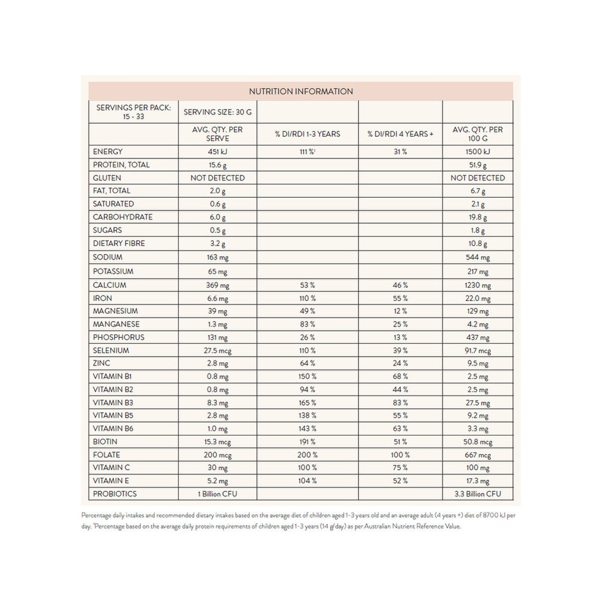 Featuring gut-friendly protein, calcium, iron, selenium, vitamins C, E, folate and other B vitamins to support optimal health and wellbeing.