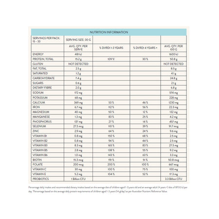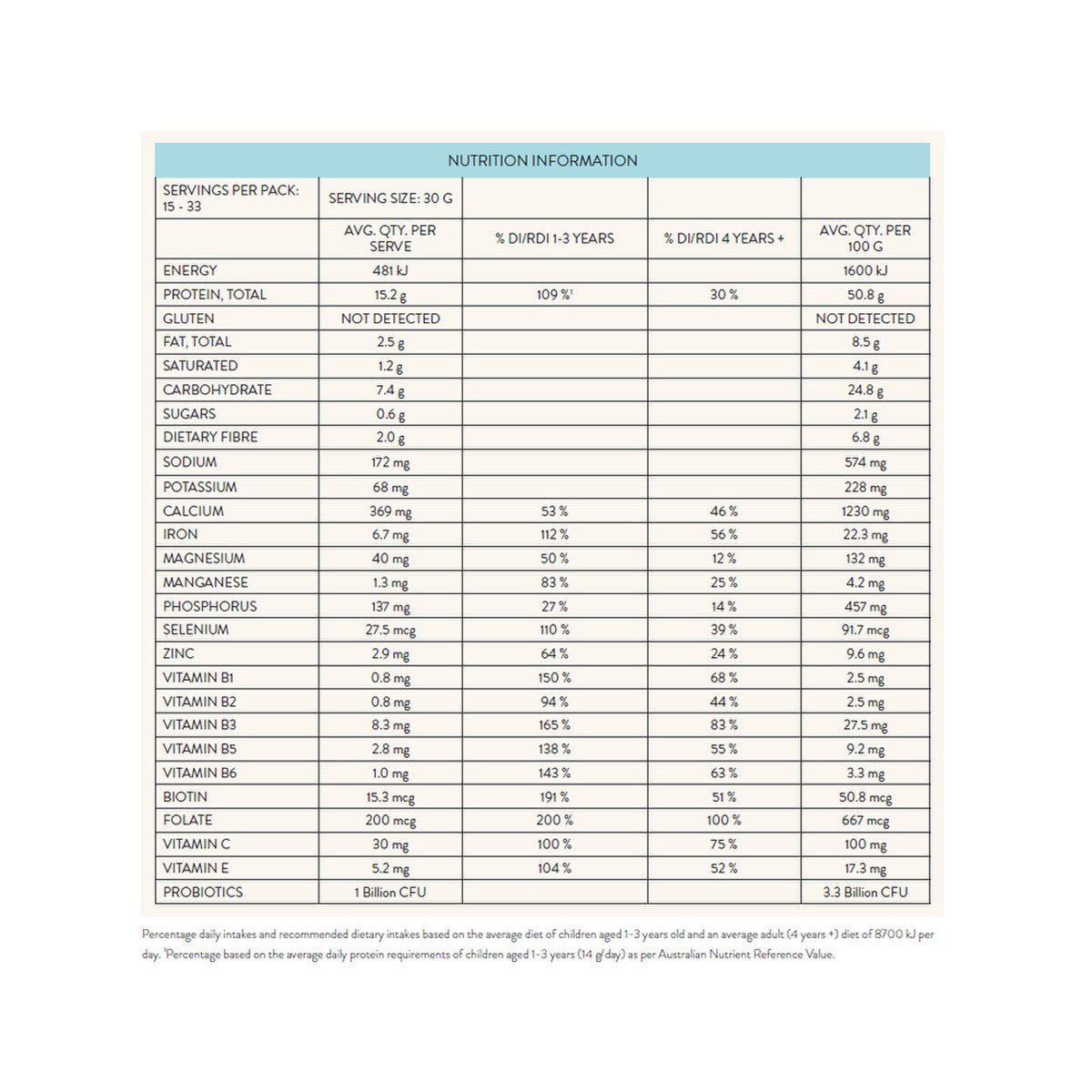 Featuring gut-friendly protein, calcium, iron, selenium, vitamins C, E, folate and other B vitamins to support optimal health and wellbeing.