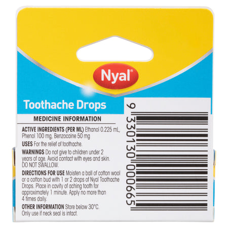 Moisten a pellet of cotton wool, or a cotton bud with 1 or 2 drops of Nyal Toothache Drops. Place in cavity of aching tooth for approximately 1 minute.