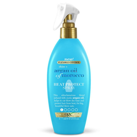 OGX Shine+ Argan Oil of Morocco Heat Protect Spray, this ultra-luxurious blend infused with exotic argan oil, helps to cut blow dry time and protect hair from heat, for big, beautiful blow outs.
