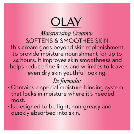 • OLAY Moisturising CreamThis cream provides long lasting moisturisation and improves skin softness and smoothness to leave it youthful looking.
