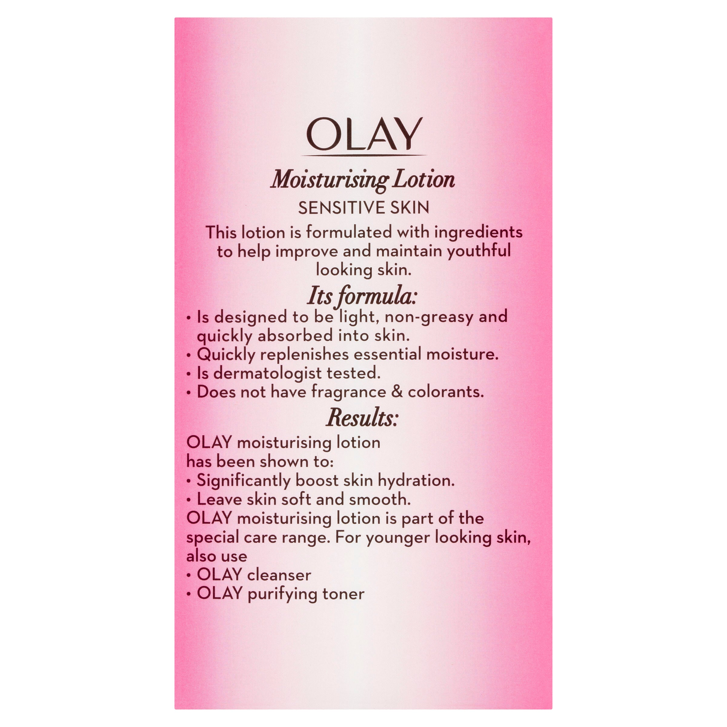 Olay moisturising lotion is part of the Essential Care range. For younger looking skin, also use:- Olay cleanser.