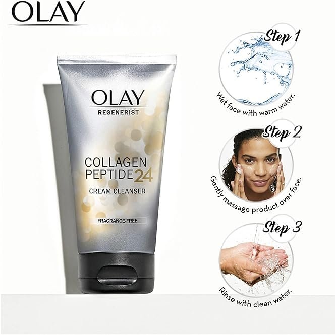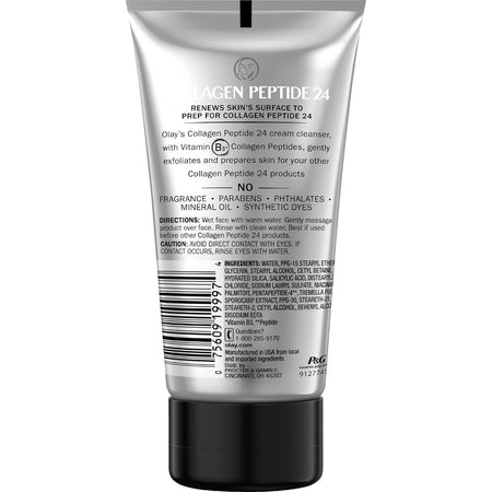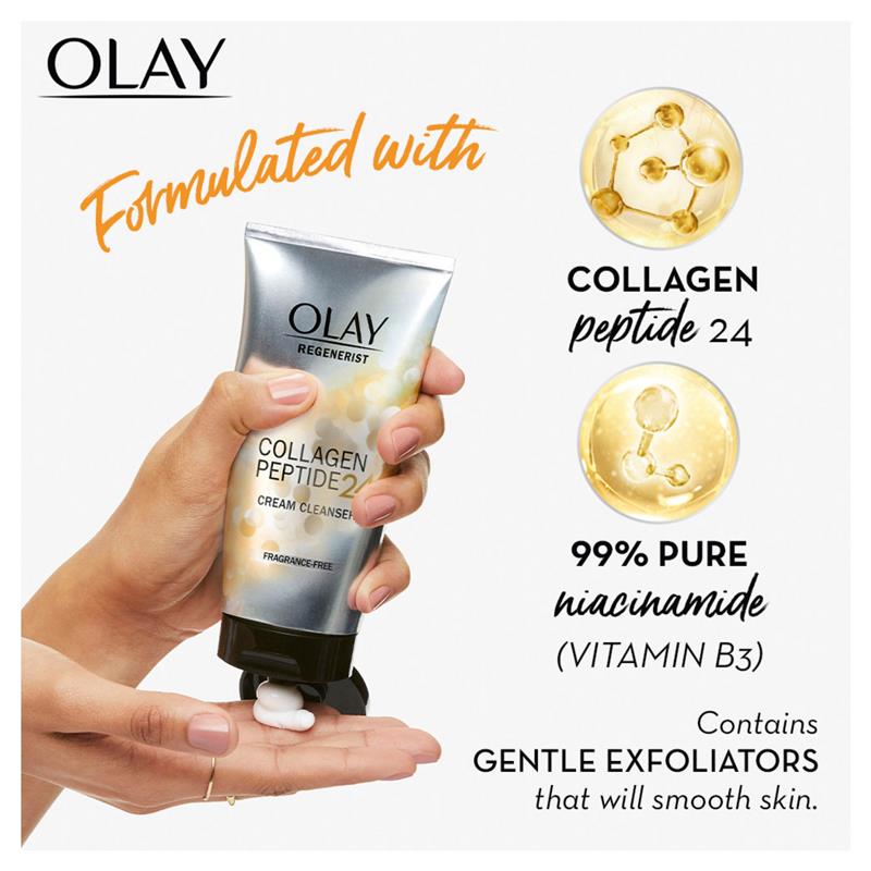 Olay Regenerist Collagen Peptide 24 Cream Cleanser with Niacinamide (Vitamin B3) + Collagen Peptides, gently exfoliates and prepares skin for your other Collagen Peptide 24 products.