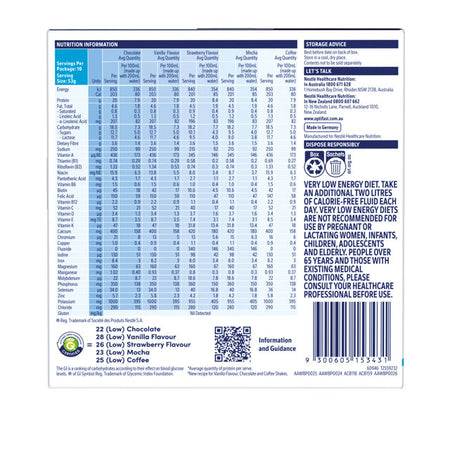 Chocolate: Skimmed Milk Powder (31%), Milk Proteins [Calcium Caseinate (20%), Sodium Caseinate (10%)], Maltodextrin (Corn), Vegetable Oil (Canola, Sunflower), Cocoa Powder (5%), Minerals (Potassium Citrate, Magnesium Carbonate, Calcium Phosphate, Sodium Chloride, Potassium Phosphate, Ferric Pyrophosphate, Copper Gluconate, Zinc Sulphate, Manganese Sulphate, Sodium Fluoride, Potassium Iodide, Sodium Molybdate, Sodium Selenite, Chromium Chloride), Vegetable Gum (414), Fructo-Oligosaccharide, Inulin, Medium Chain Triglycerides, Glucose Syrup (Corn), Sugar, Fish Oil, Emulsifiers (472c, Soy Lecithin, 471), Sweeteners (Aspartame, Acesulfame Potassium), Antioxidants (301, 304, 306), Flavour, Vitamins (Vitamin E Acetate, Nicotinamide, Calcium Pantothenate, Sodium Ascorbate, Pyridoxine Hydrochloride, Thiamine Hydrochloride, Vitamin A Acetate, Riboflavin, Folic Acid, Phytomenadione, Cholecalciferol, Cyanocobalamin, Biotin). Strawberry: Skimmed Milk Powder (31%), Milk Proteins [Calcium Caseinate (20%), Sodium Caseinate (10%)], Maltodextrin (Corn), Vegetable Oil (Canola, Sunflower), Minerals (Potassium Citrate, Magnesium Carbonate, Calcium Phosphate, Sodium Chloride, Potassium Phosphate, Ferric Pyrophosphate, Copper Gluconate, Zinc Sulphate, Manganese Sulphate, Sodium Fluoride, Potassium Iodide, Sodium Molybdate, Sodium Selenite, Chromium Chloride), Vegetable Gum (414), Fructo-Oligosaccharide, Inulin, Medium Chain Triglycerides, Glucose Syrup (Corn), Sugar, Fish Oil, Emulsifiers (472c, Soy Lecithin, 471), Colour (Beetroot), Sweeteners (Aspartame, Acesulfame Potassium), Antioxidants (301, 304, 306), Flavour, Vitamins (Vitamin E Acetate, Nicotinamide, Calcium Pantothenate, Sodium Ascorbate, Pyridoxine Hydrochloride, Thiamine Hydrochloride, Vitamin A Acetate, Riboflavin, Folic Acid, Phytomenadione, Cholecalciferol, Cyanocobalamin, Biotin). Coffee: Skimmed Milk Powder (31%), Milk Proteins [Calcium Caseinate (20%), Sodium Caseinate (10%)], Maltodextrin (Corn), Vegetable Oil (Canola, Sunflower), Minerals (Potassium Citrate, Magnesium Carbonate, Calcium Phosphate, Sodium Chloride, Potassium Phosphate, Ferric Pyrophosphate, Copper Gluconate, Zinc Sulphate, Manganese Sulphate, Sodium Fluoride, Potassium Iodide, Sodium Molybdate, Sodium Selenite, Chromium Chloride), Coffee Extract (4.5%), Vegetable Gum (414), Fructo-Oligosaccharide, Inulin, Medium Chain Triglycerides, Glucose Syrup (Corn), Sugar, Flavour, Fish Oil, Emulsifiers (472c, Soy Lecithin, 471), Sweeteners (Aspartame, Acesulfame Potassium), Antioxidants (301, 304, 306), Vitamins (Vitamin E Acetate, Nicotinamide, Calcium Pantothenate, Sodium Ascorbate, Pyridoxine Hydrochloride, Thiamine Hydrochloride, Vitamin A Acetate, Riboflavin, Folic Acid, Phytomenadione, Cholecalciferol, Cyanocobalamin, Biotin). Vanilla: Skimmed Milk Powder (31%), Milk Proteins [Calcium Caseinate (20%), Sodium Caseinate (10%)], Maltodextrin (Corn), Vegetable Oil (Canola, Sunflower), Minerals (Potassium Citrate, Magnesium Carbonate,