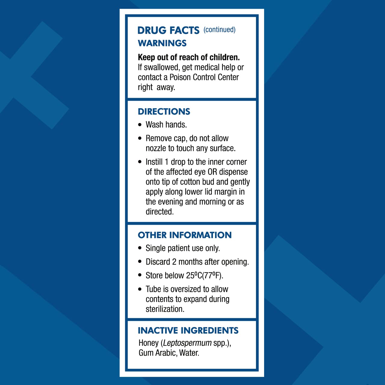Optimel Antibacterial Manuka+ Eye Drops help stabilise the surface health of the eye from dry eye symptoms such as sore, irritated eyes and eyelids. Optimel Antibacterial Manuka+ Eye Drops assist the surface health of the eye by creating a microenvironment that supports healing and prevents further damage. When applied to the surface of the eye, Optimel Antibacterial Manuka+ Eye Drops provide an environment that, through low pH, acts on bacteria that may potentially colonise the traumatised surface. Patients with tear deficiency and meibomian gland disease have an overgrowth of ocular flora. This overgrowth is thought to contribute to tear film instability and ocular surface damage. Both topical and systemic antibiotics can significantly reduce the Colony Forming Units (CFUs) in eyes with chronic lid disease. With the increase of resistance among ocular pathogens (Cernak et al 2011(1)), the efficacy of antibiotic therapeutic regimens is being reduced. Application of Optimel Antibacterial Manuka+ Eye Drops 3 times daily to the inferior conjunctival fornix can significantly reduce CFUs from baseline at month 1 in the eyelids of patients with dry eye caused by tear deficiency and/or meibomian gland disease. Reduction of CFUs reduces the potential susceptibility of the dry eye patient to bacterial conjunctivitis and keratitis. The reduction in CFUs may also assist in improving the clinical symptoms of dry eye disease by reducing the production of certain bacterial lipases that are thought to hydrolyse meibomian gland lipids. (1)1. Cernak M, Majtanova N, Cernak A, and Majtan J. (2011) Honey Prophylaxis Reduces the Risk of Endophthalmitis During the Perioperative Period of Eye Surgery. Phytother. Res. 26: 613–616.
