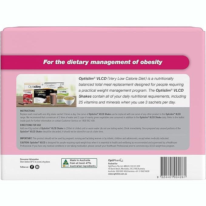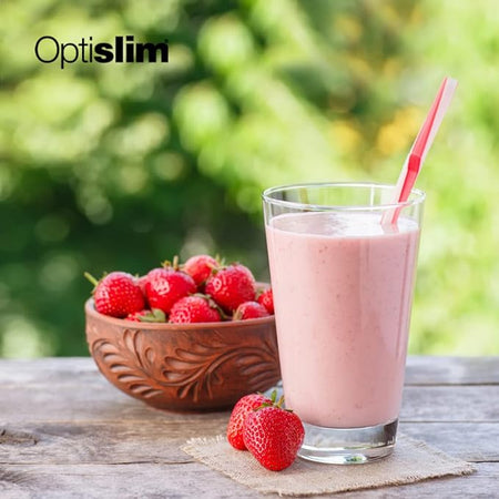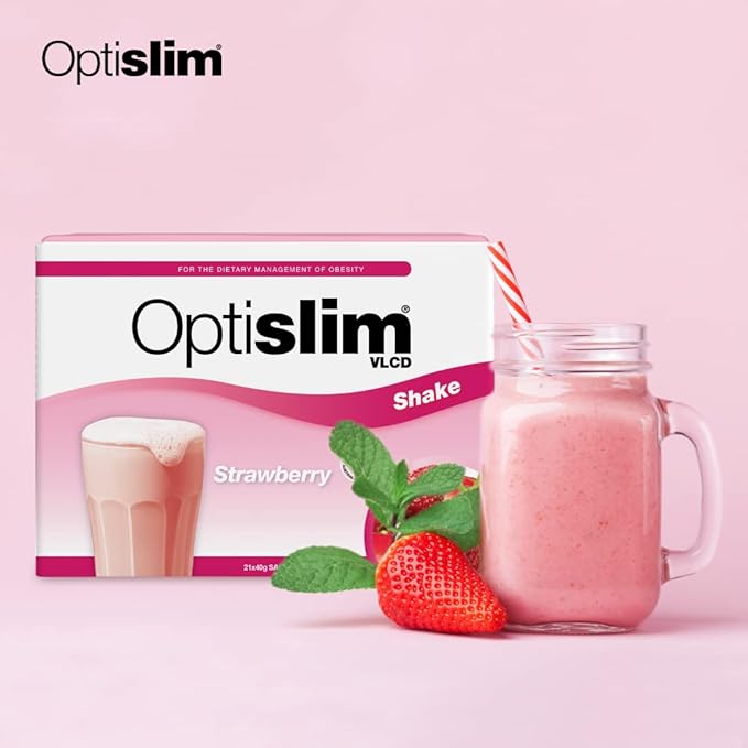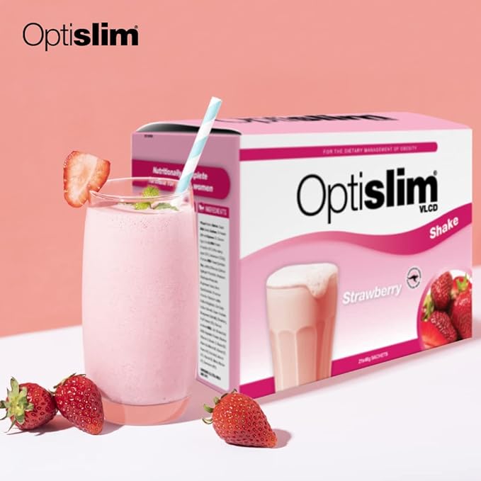 The Optislim VLCD (very low-calorie diet) Strawberry shake is a nutritionally balanced total meal replacement designed for people requiring a practical weight management program. It contains all your daily nutritional requirements, including 25 vitamins and minerals when you use three sachets per day. Remember to maintain adequate fluid intake. We recommend that a minimum of 2 litres of water is consumed per day