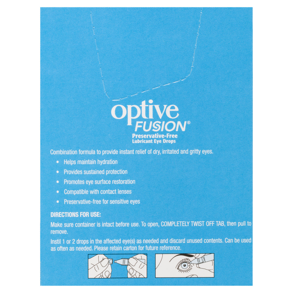 Make sure container is intact before use. To open, COMPLETELY TWIST OFF TAB, then pull to remove. Instil 1 or 2 drops in the affected eye(s) as needed and discard unused contents. Can be used as often as needed. Please retain for future reference.