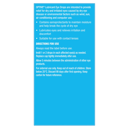 Many things can make your eyes feel dry, gritty, or uncomfortable: air conditioning, heating, computer use, reading, some medication, wind or a reduction of tears your body produces - tears that help lubricate and nourish your eyes. OPTIVE® Lubricant Eye Drops advances dry eye relief by providing a dual-action formula that moisturises the surface of your eye while also hydrating the areas where dry-eye starts, giving your eyes long-lasting moisturising protection.