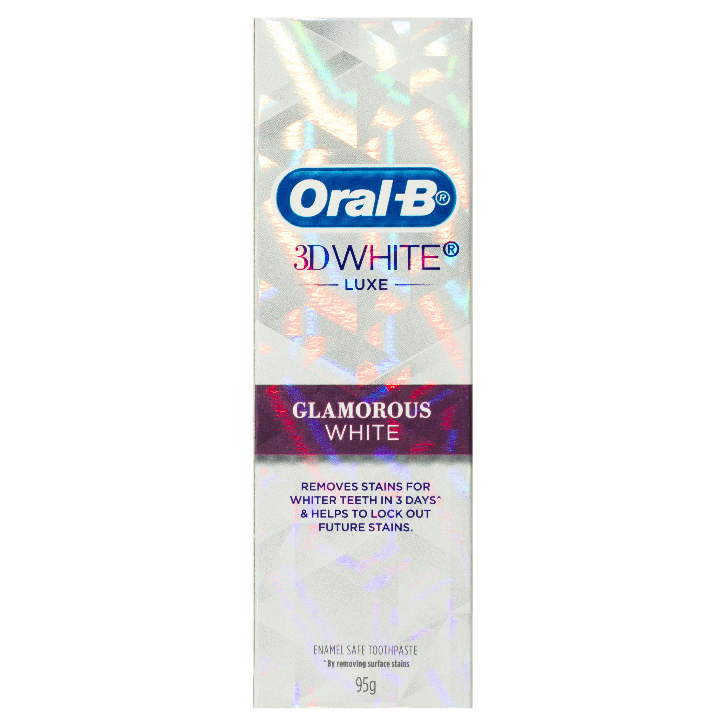 Oral-B 3D White Luxe Glamorous White Toothpaste removes stains for whiter teeth in 3 days & helps to lock out future stains.