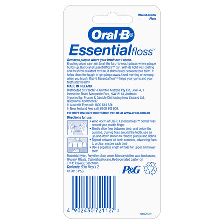 Brushing alone can't get to all the hard-to-reach places where plaque builds up. But Oral-B EssentialFloss dental floss can. With its light wax coating and its shred-resistant texture, it slides easily between your teeth. It helps clean the tough-to-get plaque away. Used morning or evening when you brush, Oral-B EssentialFloss helps your gums and your teeth stay healthy.