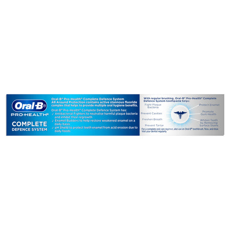 Toothpaste that's a complete defense system for your mouth! Oral-B Pro-Health Complete Defence System All Around Protection is a complete defense system for your mouth with antibacterial fighters, enamel builders, and pH shields. It provides 24-hour protection from harmful plaque bacteria* It contains an active stannous fluroide complex that helps to provide multiple oral hygiene benefits.*with twice daily brushing