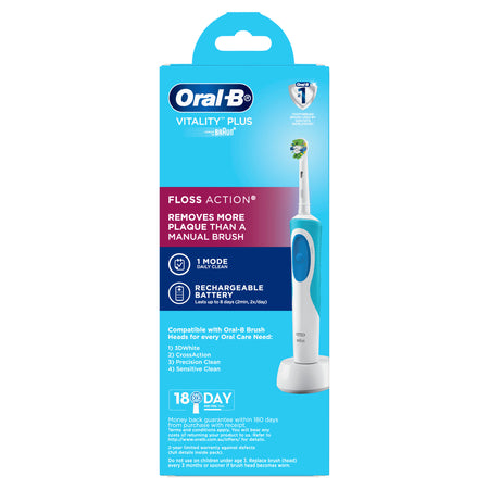-Oral-B Vitality Plus FlossAction cleans deep between teeth to remove up to 100% more plaque leaving your whole mouth cleaner than a regular manual toothbrush. Features Oral-B NEW Bristle Technology Floss Action Brush Head: Green bristles turn yellow signalling when to change.