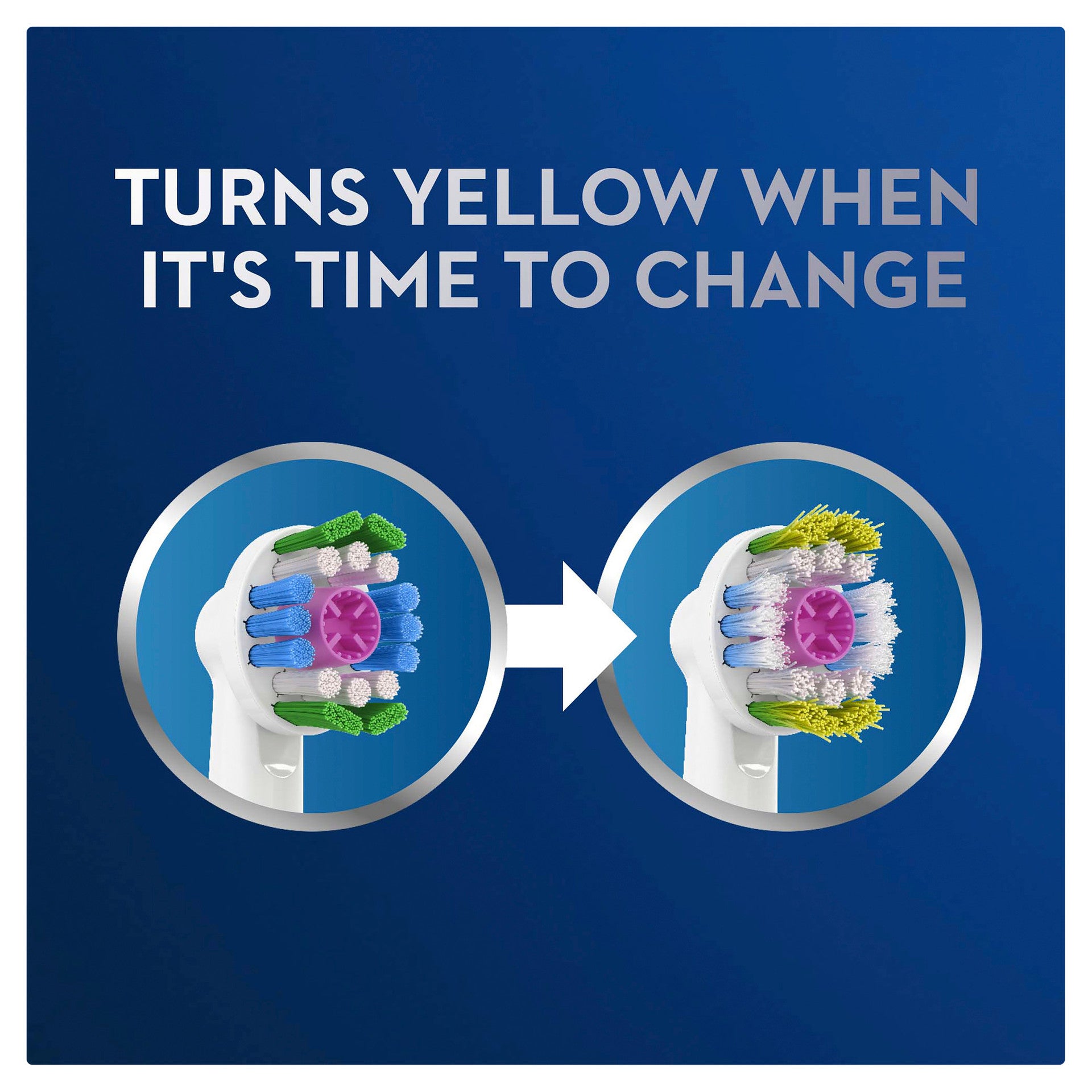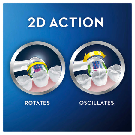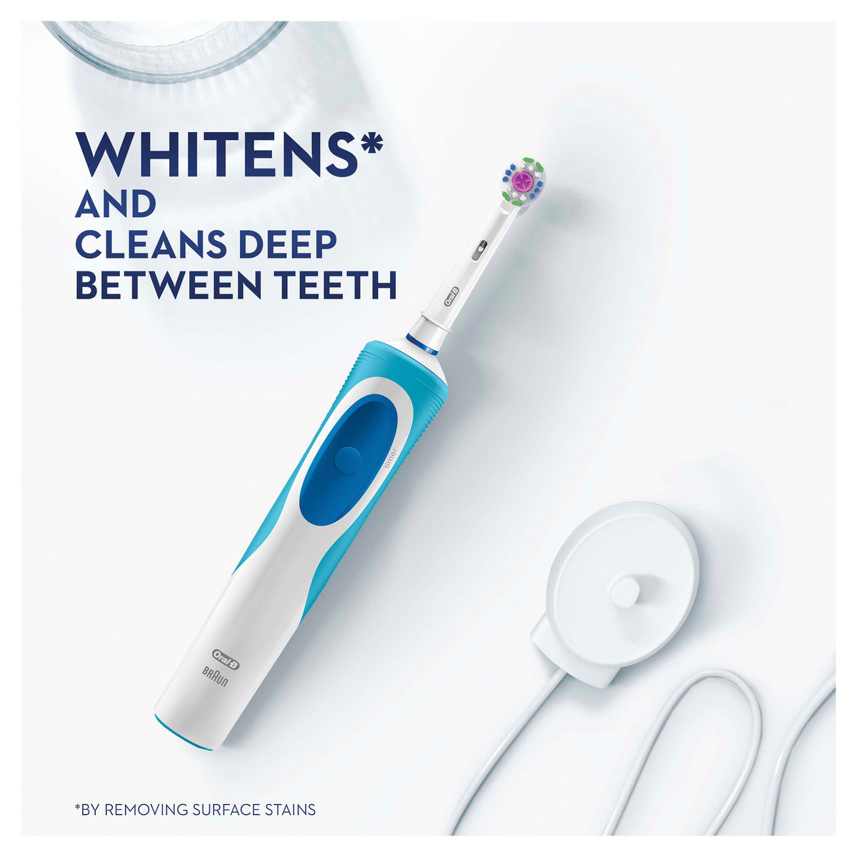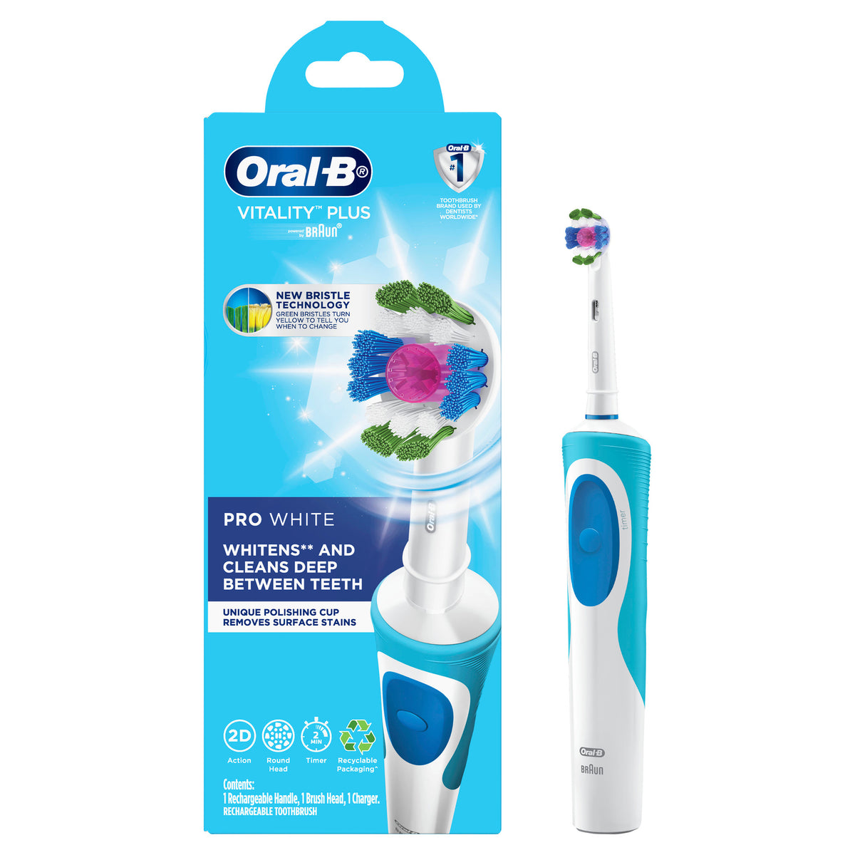 Oral-B Vitality Plus Pro White helps whiten teeth and cleans deep between teeth. Features Oral-B NEW Bristle Technology 3D White Brush Head: Green bristles turn yellow signalling when to change. Its dentist inspired round head surrounds each tooth for a superior clean. #oralb #oral-b #electrictoothbrush #toothbrush #toothpaste #floss #mouthwash #teethwhitening #refills #whitening #clean #fresh #charger #travel #kids #crossaction #colour #gum #sensitive #enamel #white #black #rose #blue #pink #mint
