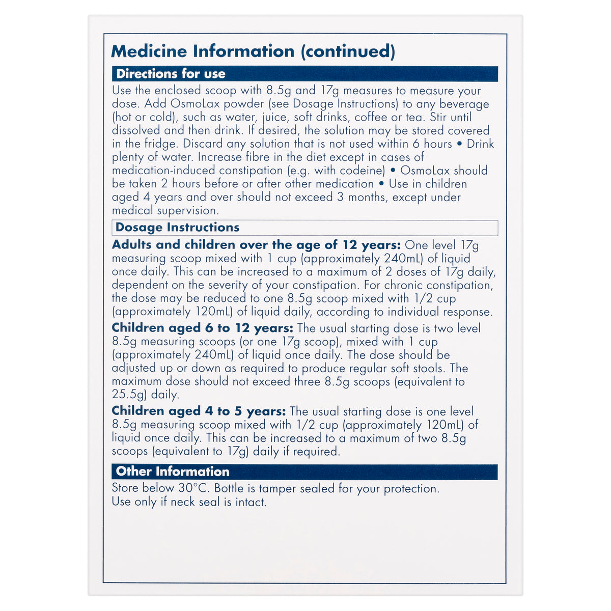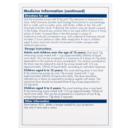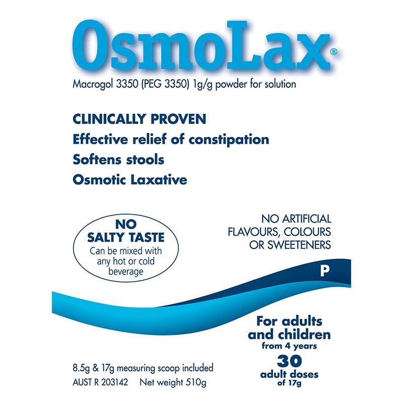 Osmolax Osmotic Laxative 30 doses in a 510g tub. Clinically proven to provide effective relief of constipation and has no salty taste.