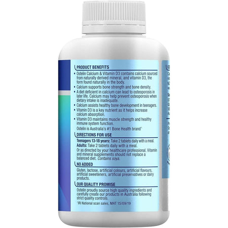 Ostelin Calcium & Vitamin D3 is a combination supplement with naturally occurring calcium and vitamin D3. Calcium increases bone mineral density, assists normal healthy bone development in teenagers, and is essential in youth and throughout life to maximise and strengthen bones. Calcium may also assist in the prevention of osteoporosis when dietary intake is inadequate. Vitamin D is essential for calcium absorption, helps support muscle function and may help maintain a healthy immune system.