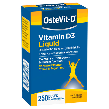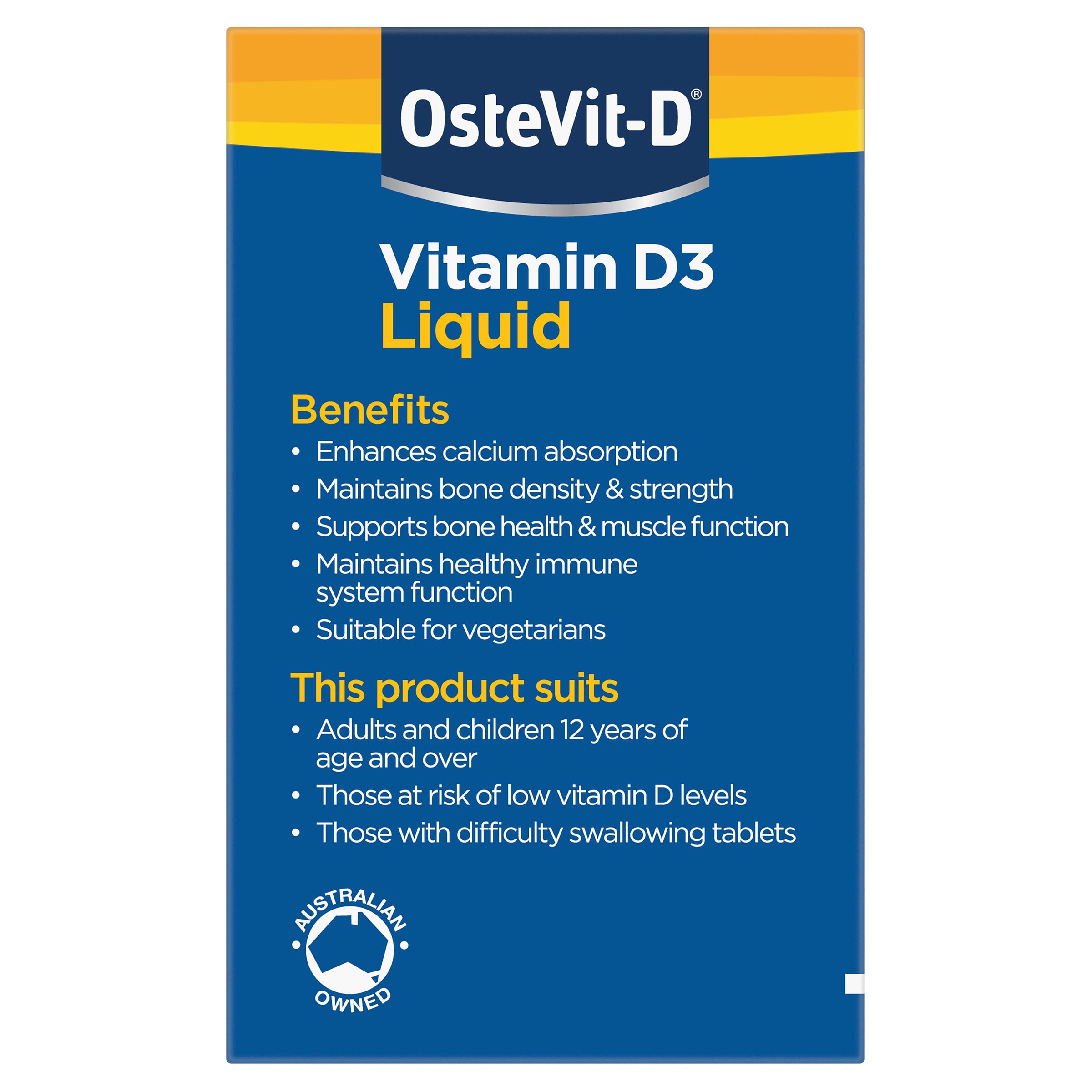 * OsteVit-D liquid contains 1000 IU per 0.2 mL. It is a convenient way to take Vitamin D for those people who find swallowing tablets difficult.