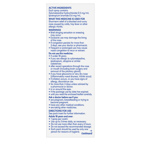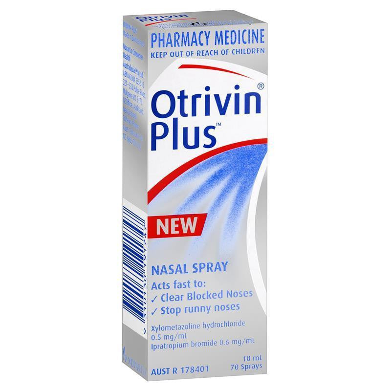 Otrivin Plus Nasal Spray contains the active ingredients xylometazoline hydrochloride 0.5 mg/mL and ipratropium bromide 0.6 mg/mL. Xylometazoline hydrochloride helps to open up and clear nasal passages by reducing swollen blood vessels. Ipratropium bromide reduces mucus production. Otrivin Plus Nasal Spray provides relief of a blocked and runny nose caused by colds, hay fever or other allergic rhinitis.Suitable For: Blocked and runny noses