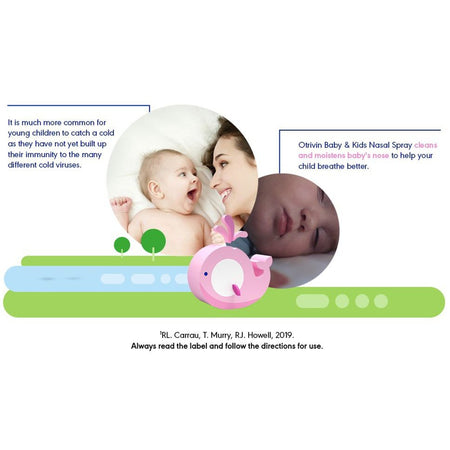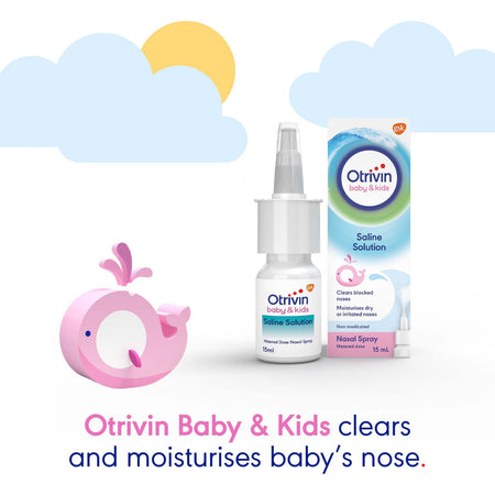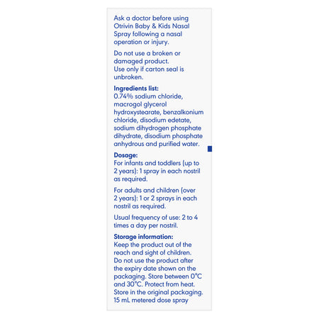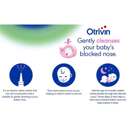 WHAT ARE OTRIVIN BABY & KIDS NASAL SPRAY?Otrivin Baby & Kids Nasal Spray is an isotonic saline solution that gently cleanses the nasal cavities when the nose is blocked by washing away the excess mucus or the allergen particles such as dust or pollen. It also moisturizes dry or irritated noses.