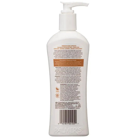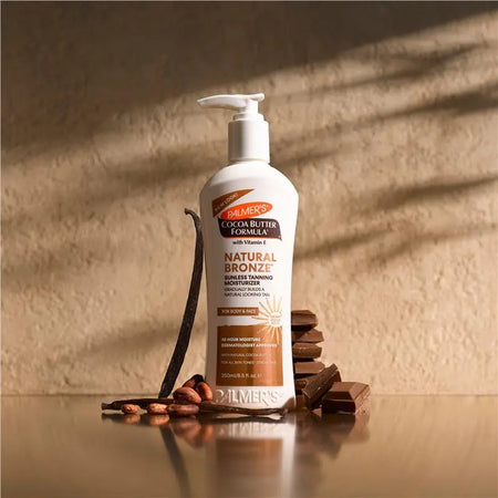 Deeply Moisturise and Glow with Palmer's Cocoa Butter Formula Natural Bronze Gradual Tanning Moisturiser, crafted with rich, natural Cocoa Butter and vegetable-derived tanning ingredients to gradually deepen skin's natural tone for a streak-free, natural-looking tan.