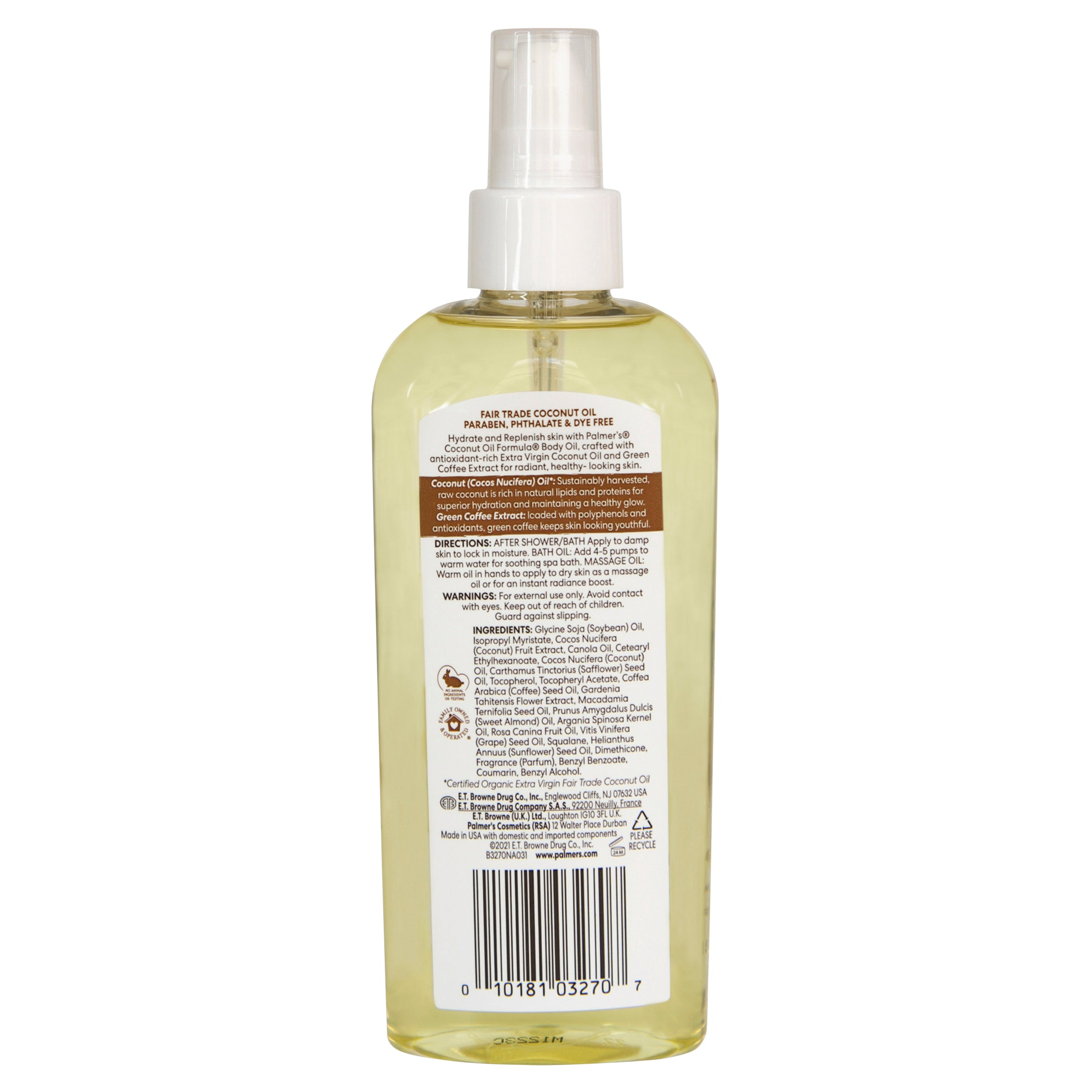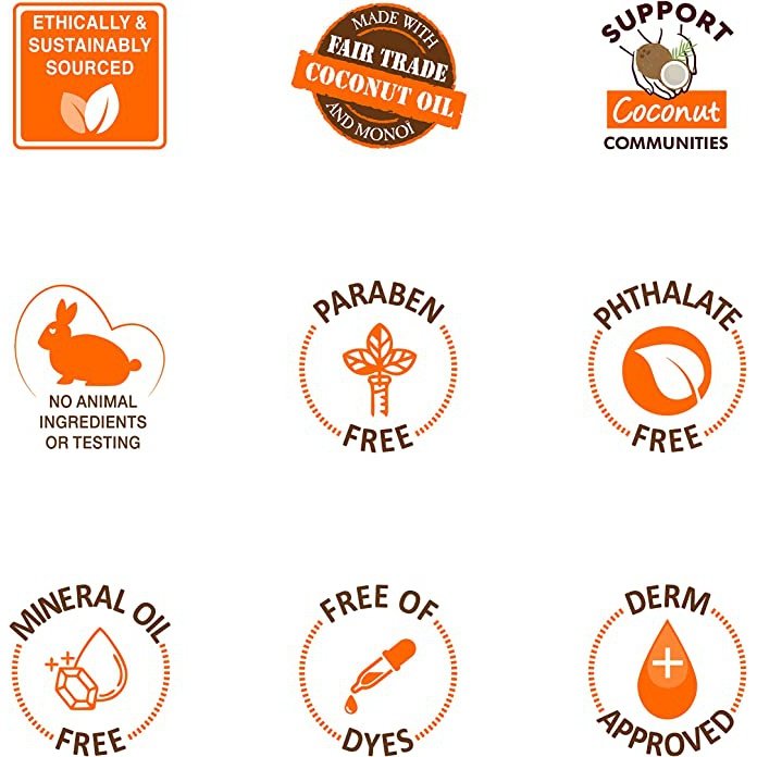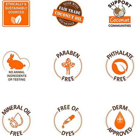 Contains ethically and sustainably sourced Coconut Oil and Tahitian Monoi Oil. No Parabens, No Phthalates, No Mineral Oil, No Sulphates, No Gluten, No Dyes.