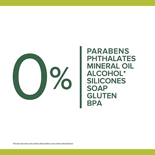 • Free from Parabens, Phthalates, Mineral Oil, Alcohol, Silicones, Soap, Gluten and BPA