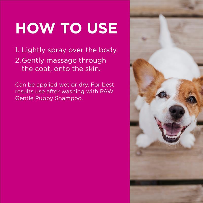 Spray lightly over the body, gently brushing through the coat. Can be applied to damp or dry fur. For best results use in conjunction with PAW by Blackmores Grooming products.