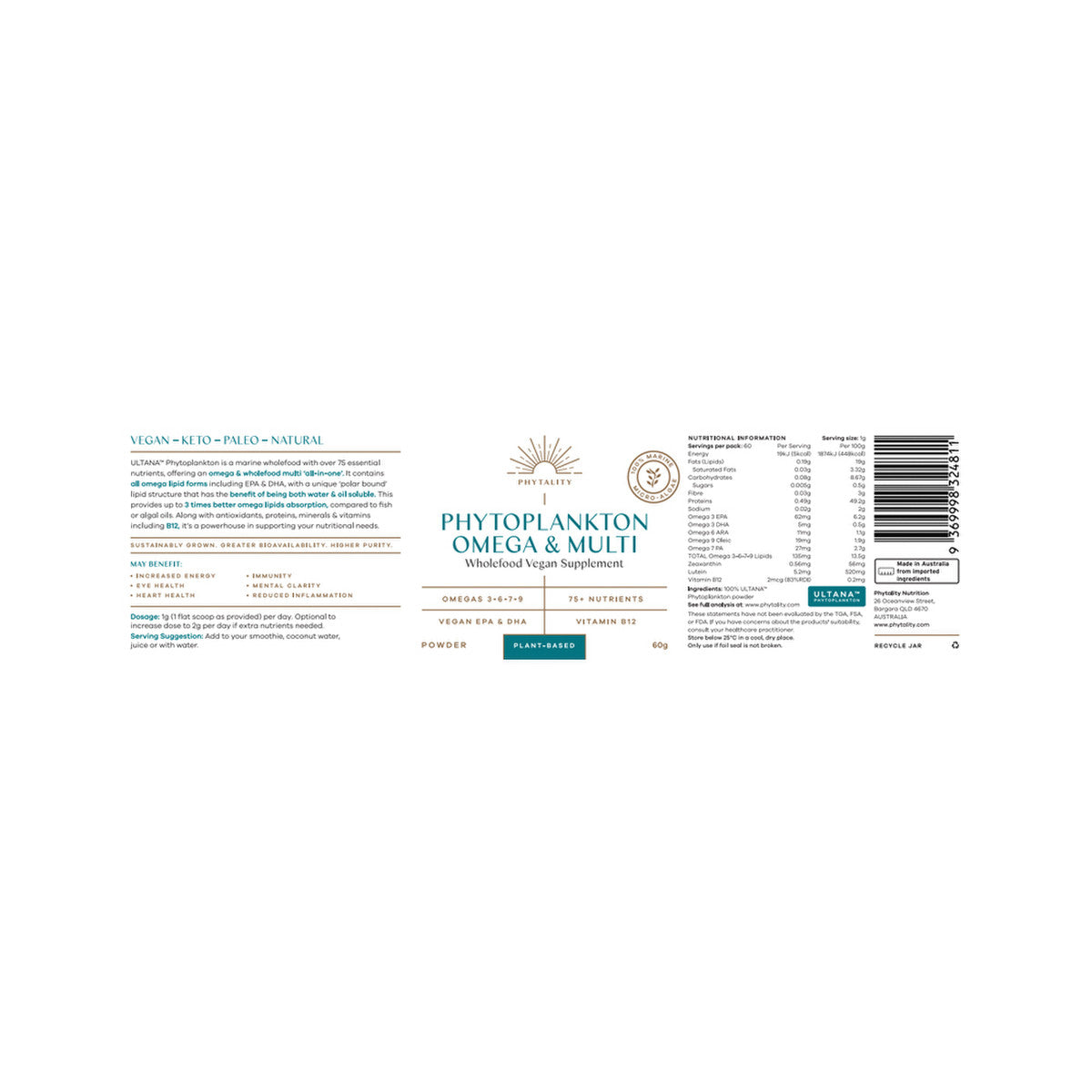 Phytality Phytoplankton Omega & Multi (Wholefood Vegan Supplement) Powder 60g