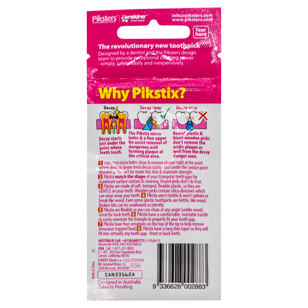 Pikstix are made from soft, flexible plastic, are triangular shaped with unique micro holes and fine edges to ensure they fit easily into the natural spaces between teeth whilst trapping plaque, food and debris. Pikstix revolutionary design assists in decay prevention whilst providing easy cleaning between the teeth at any angle.