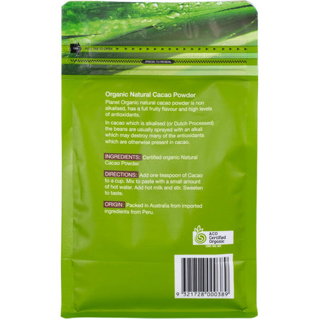 Organic natural cacao powder has a full fruity flavour and high levels of antioxidant. In cacao which is alkalised (or Dutch processed) the beans are usually sprayed with an alkali which may destroy many of the antioxidants which are otherwise present in cacao.