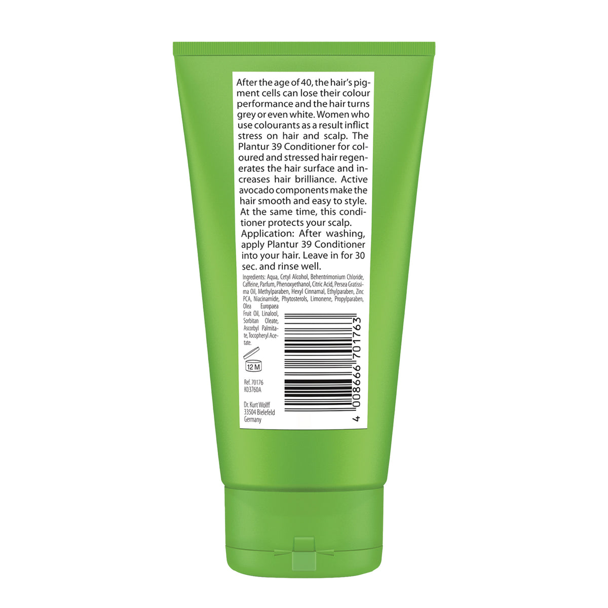 The Plantur 39 Conditioner for colored and stressed hair regenerates the hair surface and increases hair brilliance. Active avocado components make the hair smooth and easy to style. At the same time, this conditioner protects your scalp.Size: 150mL