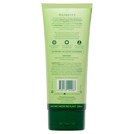 Plunkett's Hi-Potency Aloe Vera Moisturiser uses Pure Certified Organic Aloe Barbadensis Leaf Juice. It also contains natural Vitamin E, Shea Butter & Cucumber. This natural moisturiser is perfect for face and body. Easily absorbed by your skin, it refreshes and hydrates for soft, smooth skin all year round. Contains no parabens or artificial colours or fragrance.Suitable For: Suitable for dry skin.