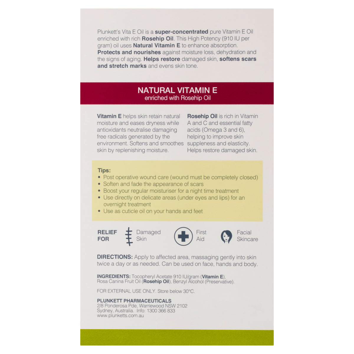 Tocopheryl Acetate 910 IU/gram (Vitamin E), Rosa Canina Fruit Oil (Rosehip Oil), Benzyl Alcohol. Does not contain mineral oil, parabens or frragrance