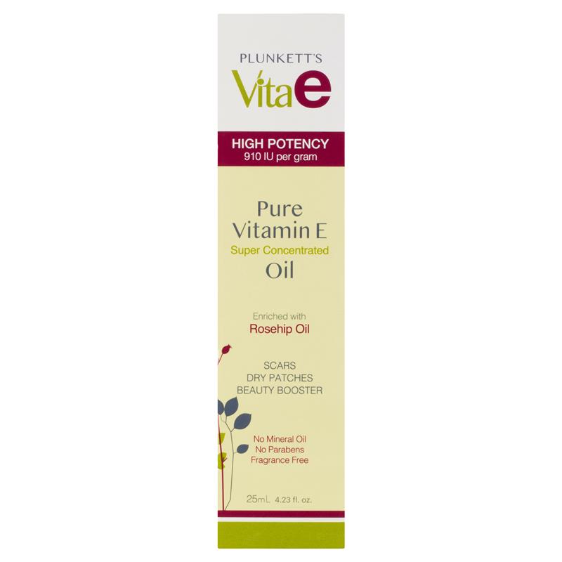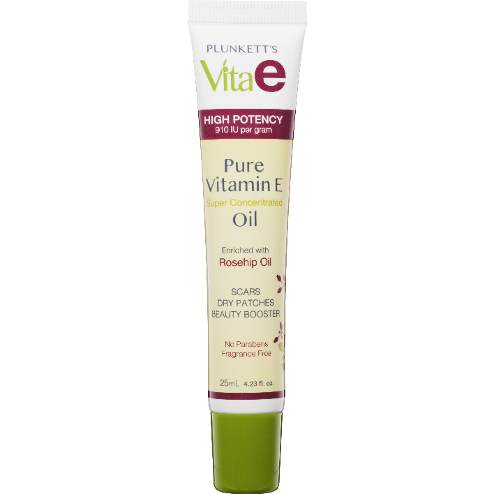 Plunkett's VIta E Oil is a super concentrated pure Vitamin E Oil enriched with Rosehip Oil. This high potency (910 IU per gram) oil uses Natural Vitamin E which is more potent than synthetic vitamin E and makes is easier to absorb. This oil protects and nourishes against moisture loss, dehydration and the signs of ageing. Ideal for scars, dry patches or as a beauty booster.Suitable For: Suitable for softening scars, using as a beauty booster with your moisturiser, and for small dry, damaged patches.