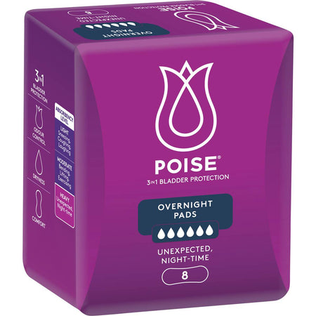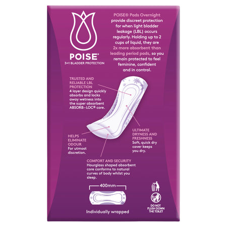 The most absorbent Poise Pad on the market, holding up to 500mls in a thin discreet pad format. Specifically designed for women who require extra protection, they are ideal for overnight use. New Softer Sides for improved all-day comfort. Extra absorbency and length - for added security and stay in place protection. Dry-Touch Layer quickly draws fluid in to help you feel drier and prevent odour. Reduced bulk for a more comfortable fit when moving about.