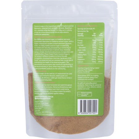 Power Super Foods Organic Coconut Sugar is a deliciously sweet and highly nutritious sun-kissed sweetener. The crystallized nectar of the tropical coconut palm tree blossom, harvested high in the swaying canopy by traditional farmers, then evaporated and crushed into a unique, unbleached, and not-too-sweet sugar alternative. It contains protein and minerals, including potassium, magnesium, phosphorus, zinc, and iron. It can be replaced with cane sugar in your coffee, tea, cocoa homemade lemonade, or iced tea. It is easily incorporated into all your favourite dessert recipes.
