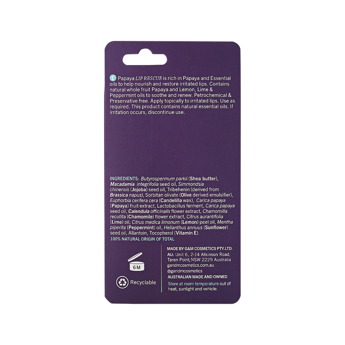 The skin on our lips is thinner than the skin on our bodies. Our lips do not have sebaceous (sweat) glands, so they need more topical nourishment & protection. Papaya Lip Rescue is a nourishing Lip Balm rich in Papaya & Essential Oils to help nourish, soothe & restore dry, irritated lips. Contains natural whole-fruit Papaya and Lemon, Lime & Peppermint oils to soothe & renew. Recommended for dry, irritated lips.
