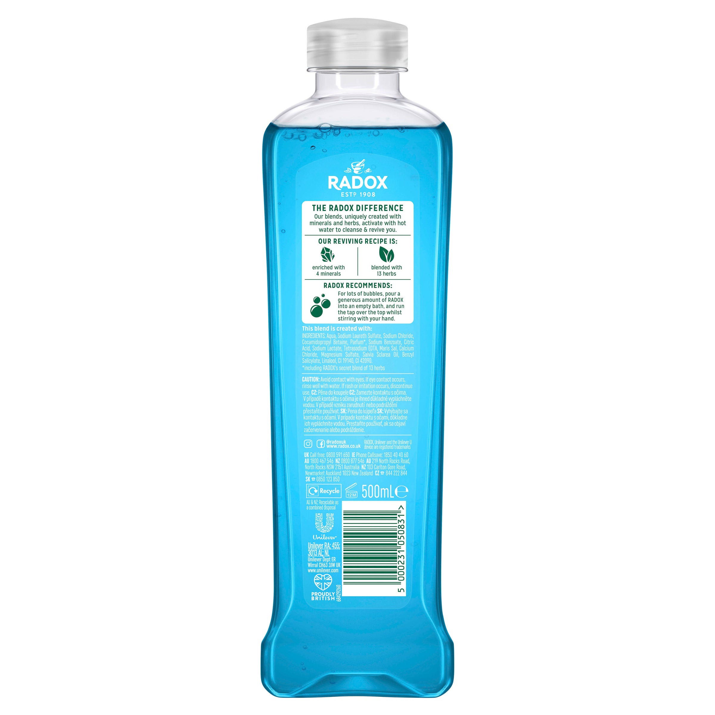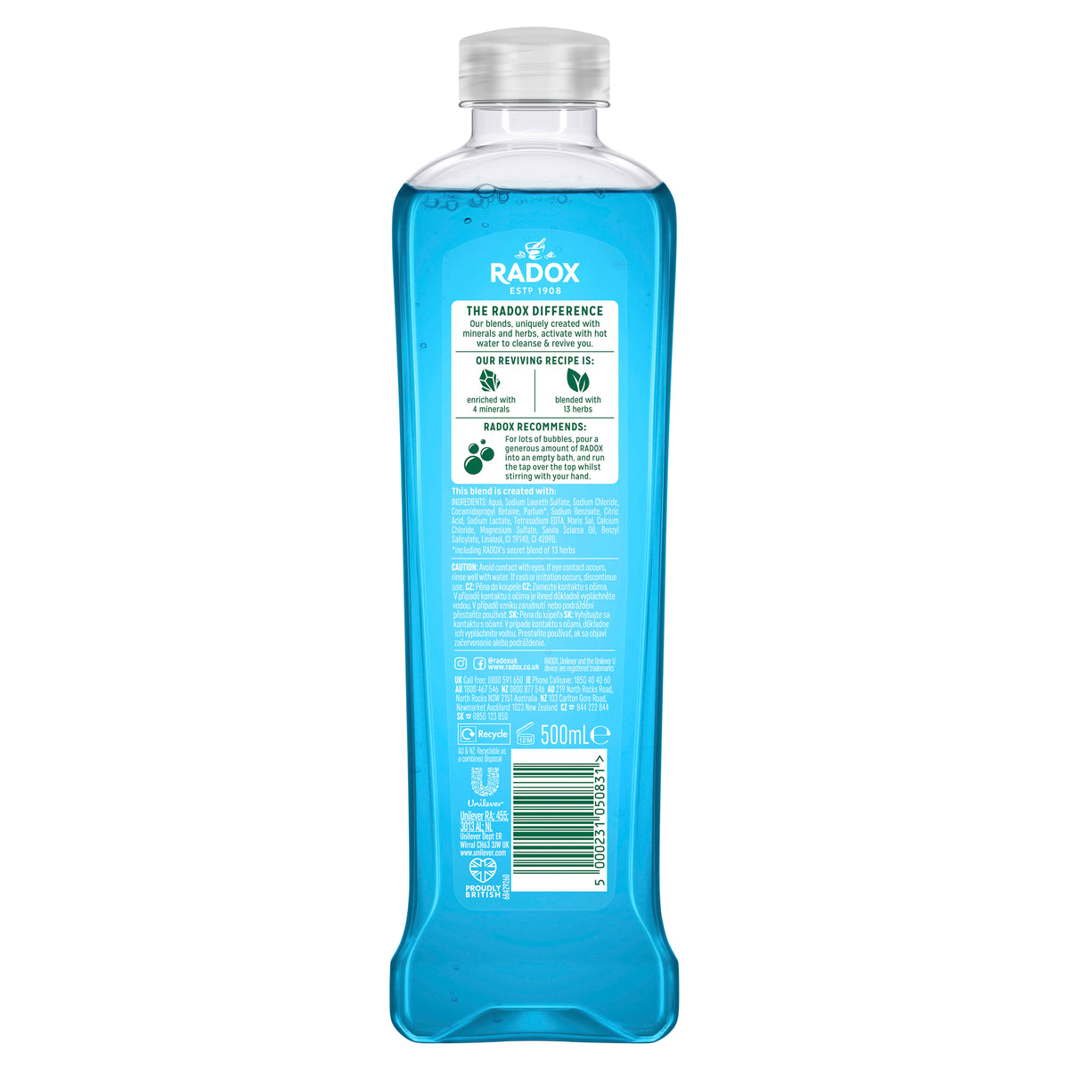 Radox Muscle Soak Bath Soak 500ml soothing relief for tired, aching or damaged muscles. Bath soak with a Sage and Sea Minerals scent inspired by nature's best ingredients. Our bath soak, with mood changing fragrance, cleanses your body and makes you feel relaxed. A refreshing bath soak that leaves your skin feeling fresh and clean. A relaxing bath soak which is pH skin neutral and suitable for all skin types. Radox bath soak products are suitable for daily use and can be enjoyed by all skin types. Radox Muscle Soak Bath Soak has a 100% nature inspired fragrance. Fill your bathroom with an enchanting Sage and Sea Minerals scent inspired by nature's best ingredients. A natural hot spring, steam rising from deep blue pools; aching muscles find relief in the enlivening mix of clary sage and sea minerals. Lean back and feel the tension melt away. A refreshing bubble bath soak which soothes your mind and makes you feel relaxed. For best results, pour the bath product under warm water before carefully stepping into the bath. Then rinse off leaving your skin feeling clean and fresh. Our bath soaks are suitable for daily use. If eye contact occurs, rinse well with warm water. In case of rash or irritation, discontinue use. At Radox, we have been taking inspiration from nature’s incredible fragrances since 1908 to create refreshing shower gels. We then capture their transformative effects with one goal in mind: to help people get in the mood they want to be in. Smell is not only one of the most important senses, but one of the most overlooked. Fragrance has the power to lift you when you’re down, to awaken you when you rise, to make us sleep, love, create, dream. It has the power to genuinely transform how you feel. In fact, there's hardly a mood that cannot be moved by fragrance. And there’s barely a person on earth who can’t be affected by the right scent. Bath Soaks with nature inspired fragrance to transform your mood.