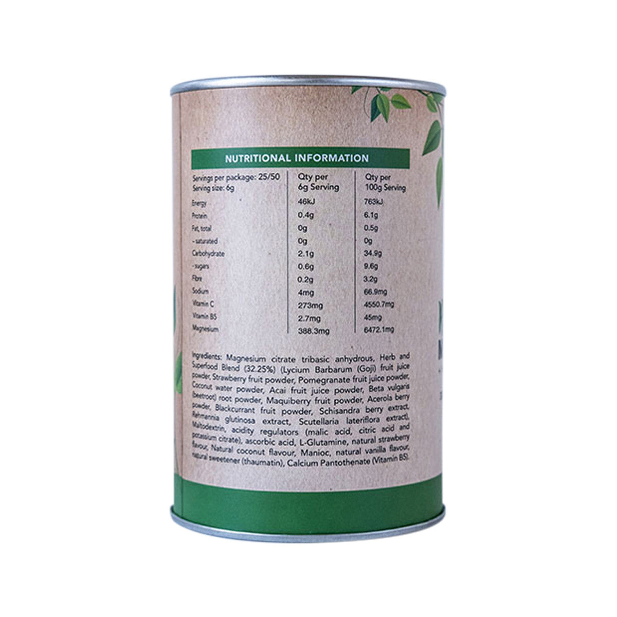 Magnesium citrate tribasic anhydrous, Herb & Superfood Blend (32.25%) (Lycium barbarum (Goji) fruit juice powder, Strawberry fruit powder, Pomegranate fruit juice powder, Coconut water powder, Acai fruit juice powder, Beta vulgaris (beetroot) root powder, Maquiberry fruit powder, Acerola berry powder, Blackcurrant fruit powder, Schisandra berry extract, Rehmania glutinosa extract, Scutellaria lateriflora extract), Maltodextrin, acidity regulators (malic acid, citric acid and potassium citrate), ascorbic acid, L-Glutamine, natural strawberry flavour, natural coconut flavour, Manioc, natural vanilla flavour, natural sweetener (thaumatin), Calcium Pantothenate (Vitamin B5).