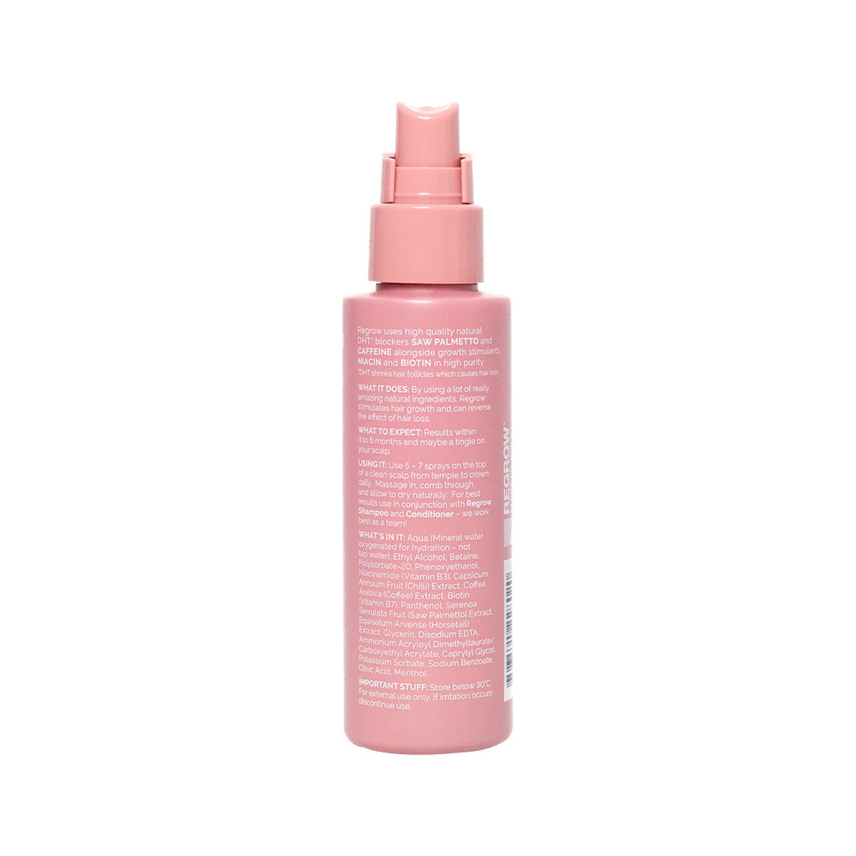 Use 5 – 7 sprays on the top of a clean, dry scalp from temple to crown once daily. Massage in, comb through and allow to dry naturally. For best results, use in conjunction with Regrow Shampoo and Conditioner – we work best as a team.
