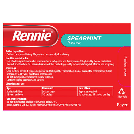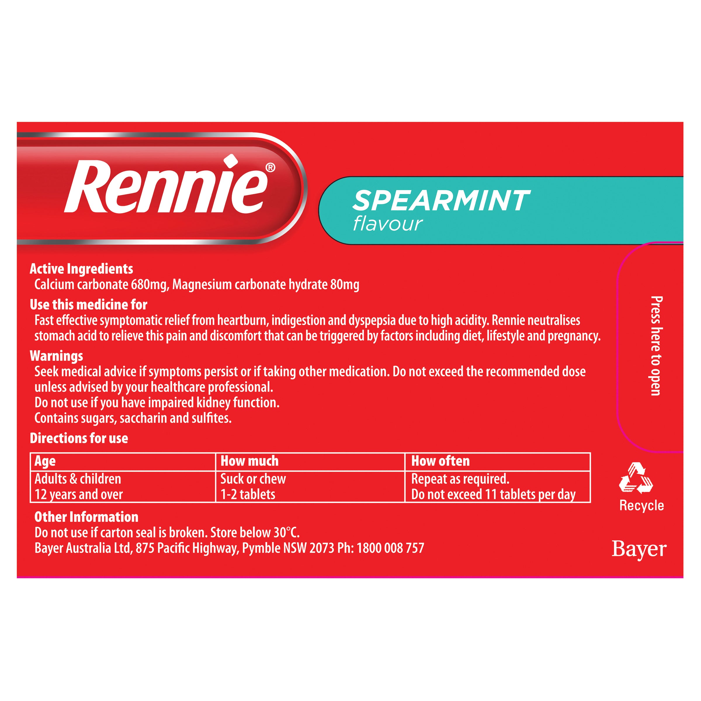 Rennie is an antacid that relieves the pain and discomfort of heartburn and indigestion by neutralising excess acidity in the stomach. Rennie is specifically formulated to provide fast, effective temporary relief from heartburn and indigestion, and is used by millions of people around the world each year. Rennie tablets are spearmint flavoured and contain the naturally occurring active ingredients calcium carbonate and magnesium carbonate. Unlike some antacids, Rennie is aluminum free and does not cause constipation.