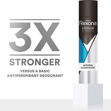 No sweat. It’s no big deal, right? Actually, sometimes it is. Sometimes sweating can hold you back. Your usual antiperspirant may not quite cut it. It's time to discover something stronger. Something anti sweat. A clinical strength antiperspirant you can rely on. Although sweating may hold you back from day to day activities, it’s no match for our Clinical Protection Antiperspirant for men. It won’t let you down. To combat heavy sweating and help you stay dry and fresh, Rexona has developed breakthrough Defence+ Technology that creates an anti sweat micro shield to help protect you from sweat for 96 hours. Our clever antiperspirant is 3x stronger versus a basic antiperspirant, making it extra-enduring. Specially formulated to provide clinical protection when you need it most – which is sometimes every day. This clinical strength antiperspirant helps form a barrier against sweat for that fresh feeling, no matter what. Feel unstoppable all day with our best antiperspirant spray. The scent? Rich, earthy cedarwood with hints of red fruits and rich florals. A classically masculine fragrance that lasts. This antiperspirant comes in aerosol spray. To apply, spray the aerosol daily to clean, dry underarms. Unlike basic antiperspirant, there’s no need to reapply.Boxed Contents: 180 ML